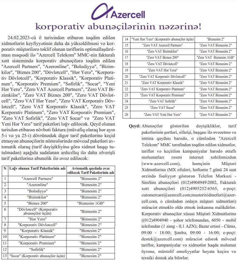 "Azercell Telekom" şirkəti 24 Fevral 2023-cü il tarixindən fakturalı xətt sistemində korporativ müştərilərə təqdim edilən 33 tarif paketini ləğv edəcək.