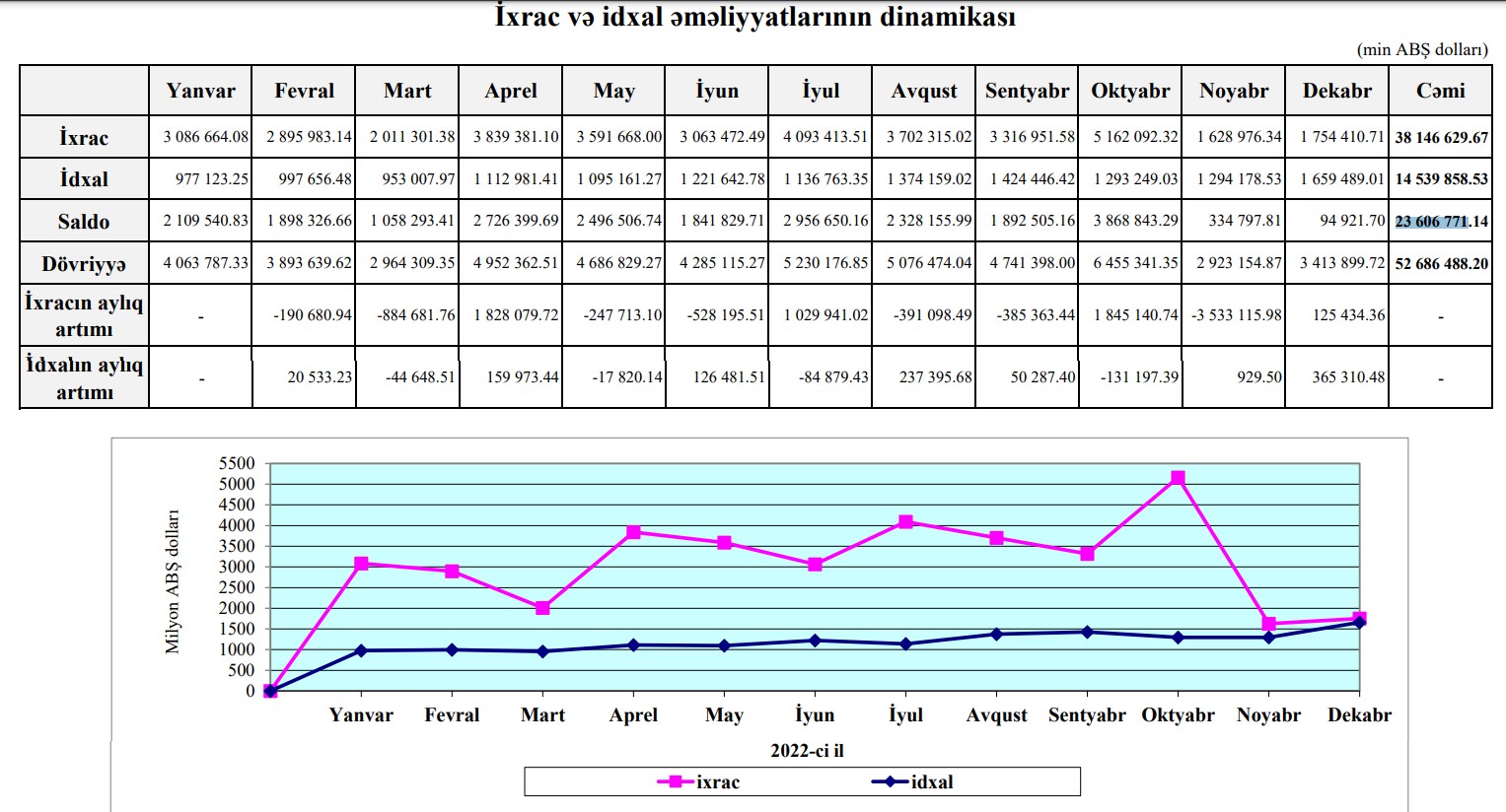 Marja.az Dövlət Gömrük Komitəsinə istinadən xəbər verir ki, ixrac əməliyyatları üzrə 38 milyard 146 milyon 629 min ABŞ dolları, idxal əməliyyatları üzrə 14 milyard 539 miylon 858 min ABŞ dolları ticarət baş tutub.