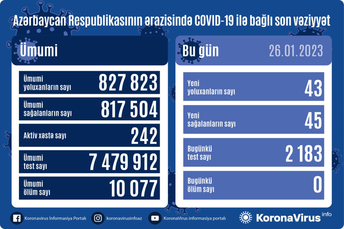 Azərbaycan Respublikasında koronavirus (COVID-19) infeksiyasına 43 yeni yoluxma faktı qeydə alınıb, 45 nəfər müalicə olunaraq sağalıb.