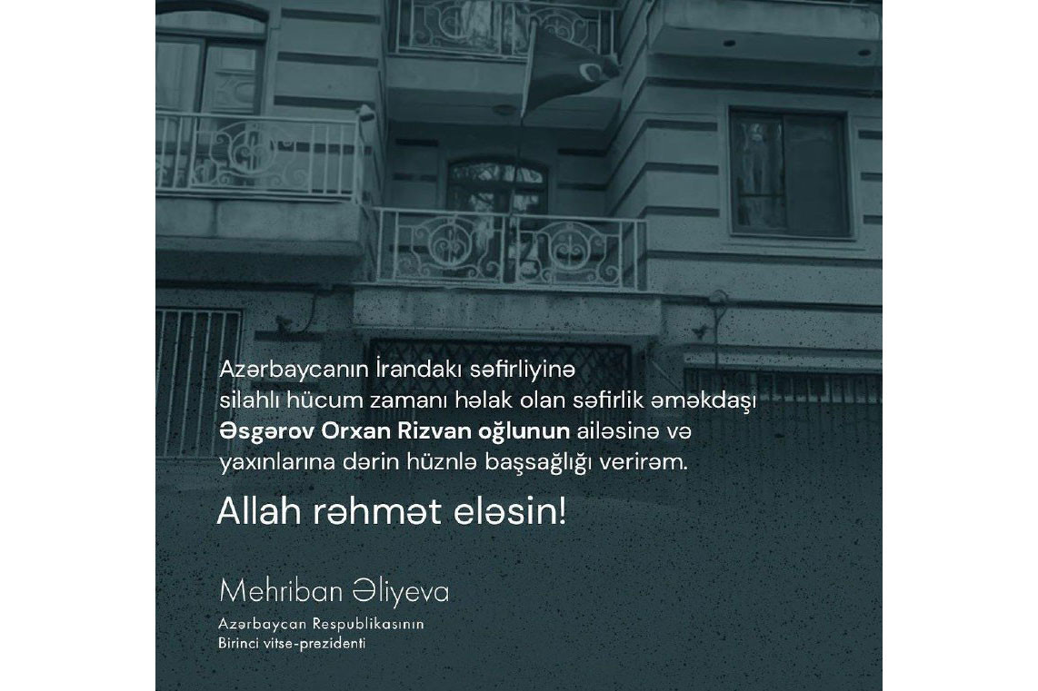 Azərbaycan Respublikasının Birinci vitse-prezidenti Mehriban Əliyeva rəsmi instaqram səhifəsində ölkəmizin İrandakı səfirliyinə silahlı hücumla bağlı paylaşım edib.