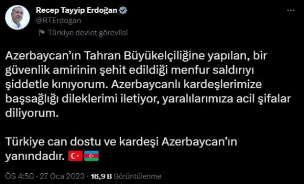 Ərdoğan Azərbaycanın İrandakı səfirliyinə hücumu qınayıb: "Türkiyə can dostu Azərbaycanın yanındadır""Azərbaycanın Tehrandakı səfirliyində bir mühafizə əməkdaşının şəhid olduğu hücumu şiddətlə qınayıram".