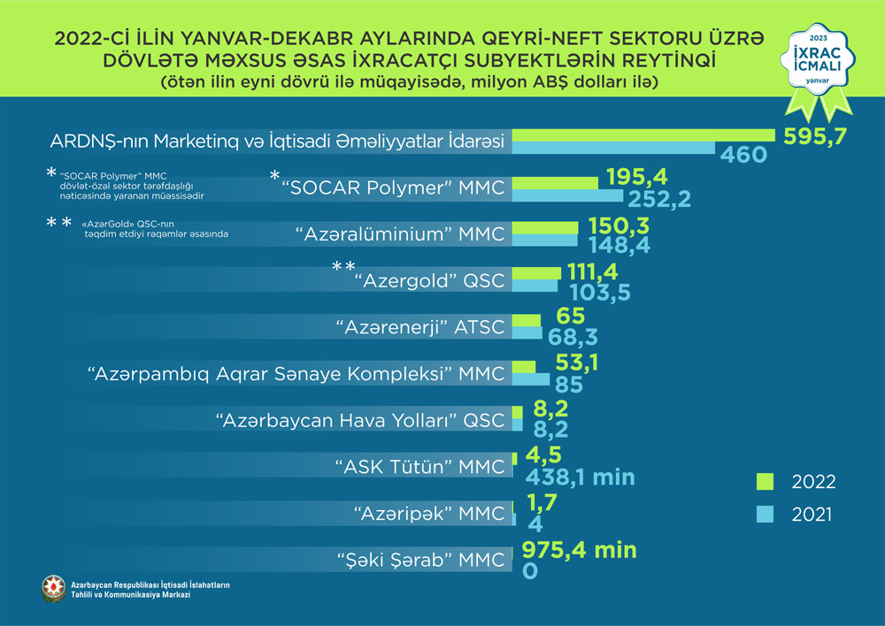 “İxrac İcmalı” tərəfindən qeyri-neft sektoru üzrə 2022-ci ilin yanvar-dekabr aylarında həyata keçirilən ixracla bağlı həm qeyri-dövlət, həm də dövlətə məxsus ixracatçı subyektlərin reytinqi tərtib edilib.