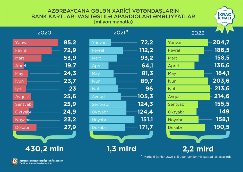 2022-ci ilin dekabr ayında xarici vətəndaşların bank kartları vasitəsi ilə ölkəmizdə apardıqları əməliyyatların həcmi 190,5 milyon manat təşkil edib. 2022-ci ilin yanvar-dekabr aylarında isə əcnəbilər bank kartları vasitəsi ilə 2,2 milyard manatlıq əməliyyat aparıblar.