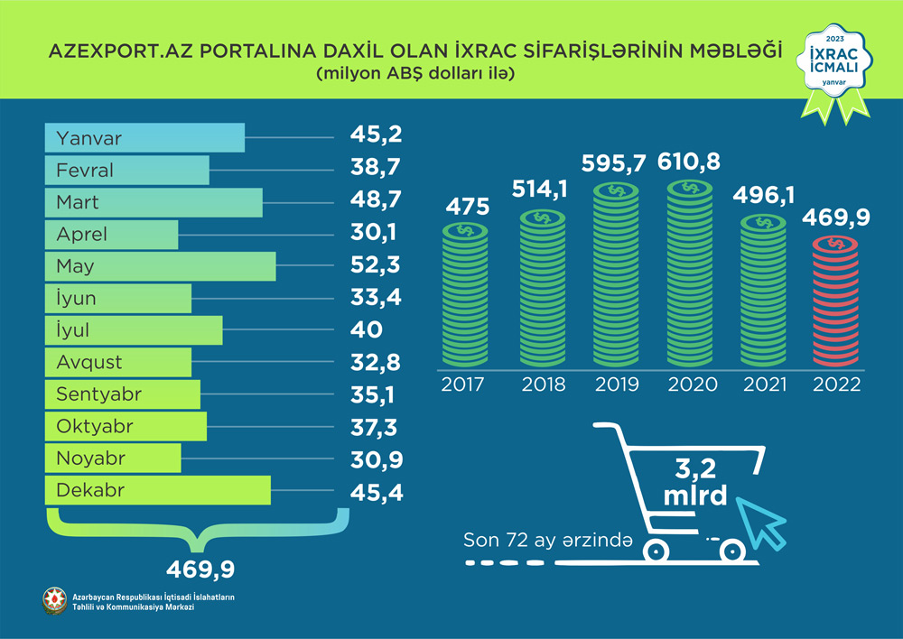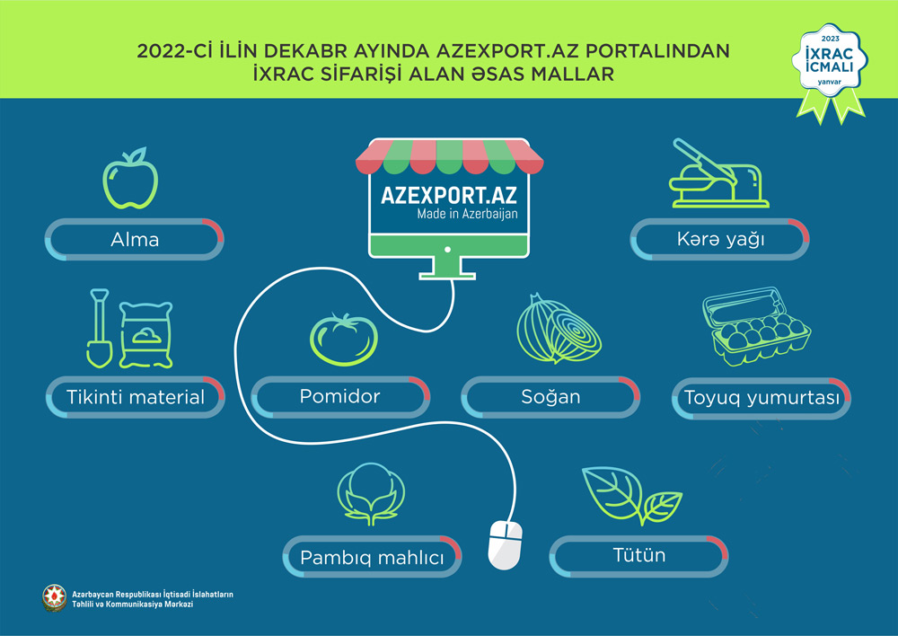 2022-ci ilin yanvar-dekabr aylarında Azexport.az portalına 469,9 milyon ABŞ dolları dəyərində ixrac sifarişləri daxil olub. 2022-ci ilin dekabr ayında Azexport.az portalına daxil olan ixrac sifarişlərinin dəyəri isə 45,4 milyon ABŞ dolları təşkil edib. 2022-ci ilin dekabr ayında Azexport.az portalına edilən ixrac sifarişlərinin kərə yağı, tütün, balıq kürüsü, tikinti materialı, alma, pomidor, pambıq yağı, pambıq mahlıcı, soğan, toyuq yumurtası və s. məhsullar üstünlük təşkil edib. Məlumat üçün qeyd edək ki, 2017-ci ilin yanvar ayından 2022-ci ilin 31 dekabr tarixinə kimi (72 ay ərzində) Azexport.az portalına dünyanın 145 ölkəsindən daxil olan ixrac sifarişlərinin dəyəri 3,2 milyard ABŞ dolları təşkil edib.