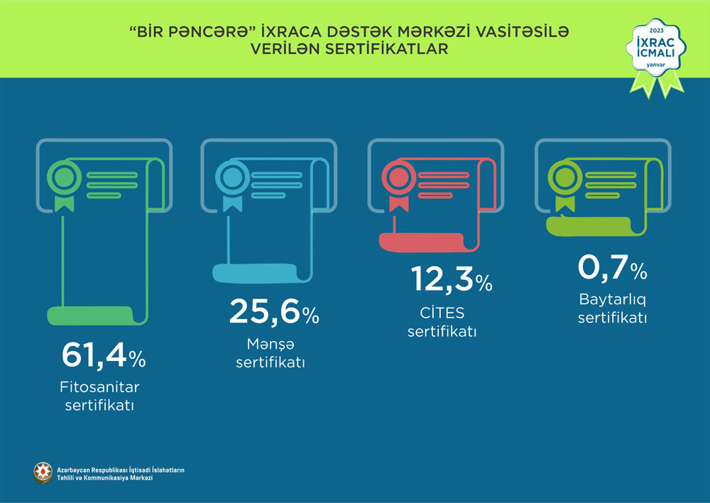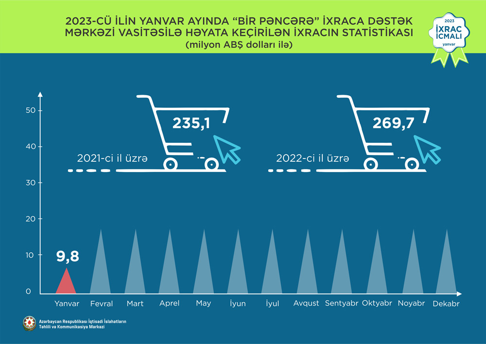 Həmçinin “İxrac İcmalı”nda göstərilib ki, 2023-cü ilin yanvar ayında “Bir Pəncərə” İxraca Dəstək Mərkəzi vasitəsi ilə həyata keçirilən qeyri-neft ixracının dəyəri 9,8 milyon ABŞ dolları olub.