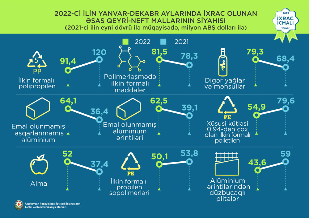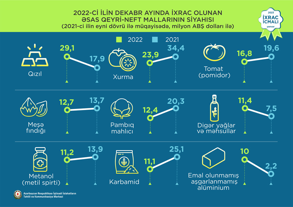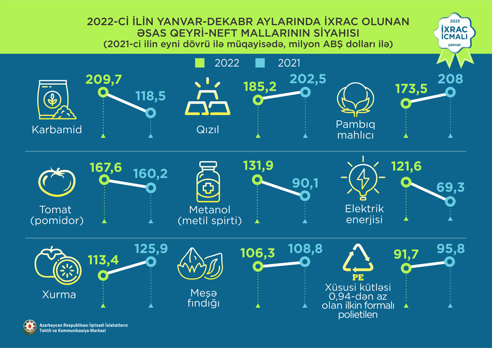 2022-ci ilin yanvar-dekabr ayları ərzində ixrac edilən qeyri-neft sektoruna aid malların siyahısında karbamid (209,7 milyon ABŞ dolları) birinci olub. Bu siyahıda qızıl (185,2 milyon ABŞ dolları) ikinci, pambıq mahlıcı (173,5 milyon ABŞ dolları) isə üçüncü yerdə qərarlaşıb.