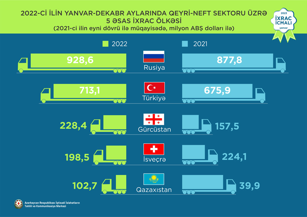 2022-ci ilin yanvar-dekabr ayları ərzində Rusiya Federasiyasına 928,6 milyon ABŞ dolları, Türkiyəyə 713,1 milyon ABŞ dolları, Gürcüstana 228,4 milyon ABŞ dolları, İsveçrə Konfederasiyasına 198,5 milyon ABŞ dolları və Qazaxıstana isə 102,7 milyon ABŞ dolları dəyərində qeyri-neft sektoruna aid mal ixrac olunub.