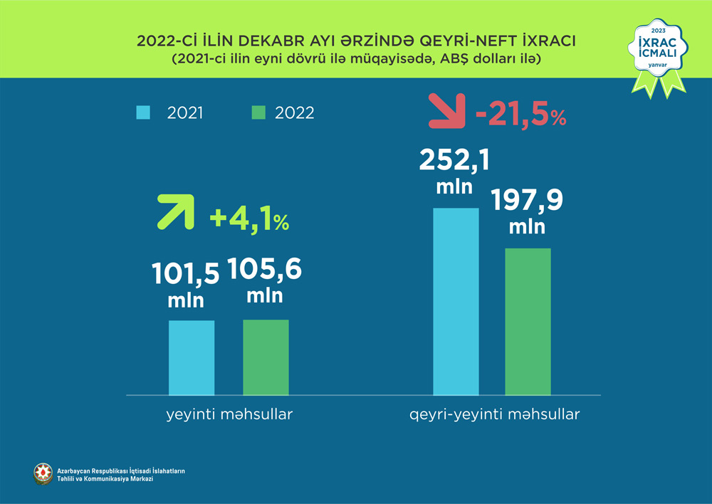 2022-ci ilin dekabr ayının qeyri-neft ixracı 303,5 milyon ABŞ dolları təşkil edib. 2022-ci ilin dekabr ayı ərzində yeyinti məhsulları üzrə ixrac 105,6 milyon ABŞ dolları, qeyri-yeyinti məhsulları üzrə isə 197,9 milyon ABŞ dollarına bərabər olub.