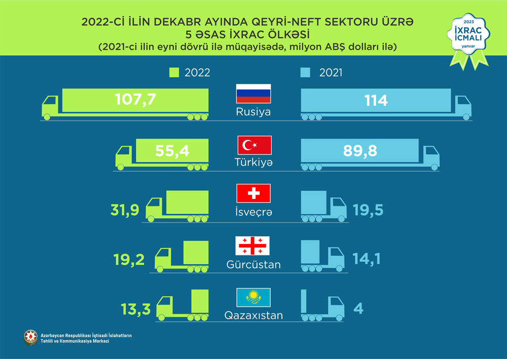 2022-ci ilin dekabr ayında qeyri-neft sektoruna aid ən çox mal ixrac edilən ölkələrin siyahısında Rusiya Federasiyası (107,7 milyon ABŞ dolları) birinciliyə yüksəlib. Bu siyahıda Türkiyə (55,4 milyon ABŞ dolları) ikinci və İsveçrə (31,9 milyon ABŞ dolları) üçüncü olub.