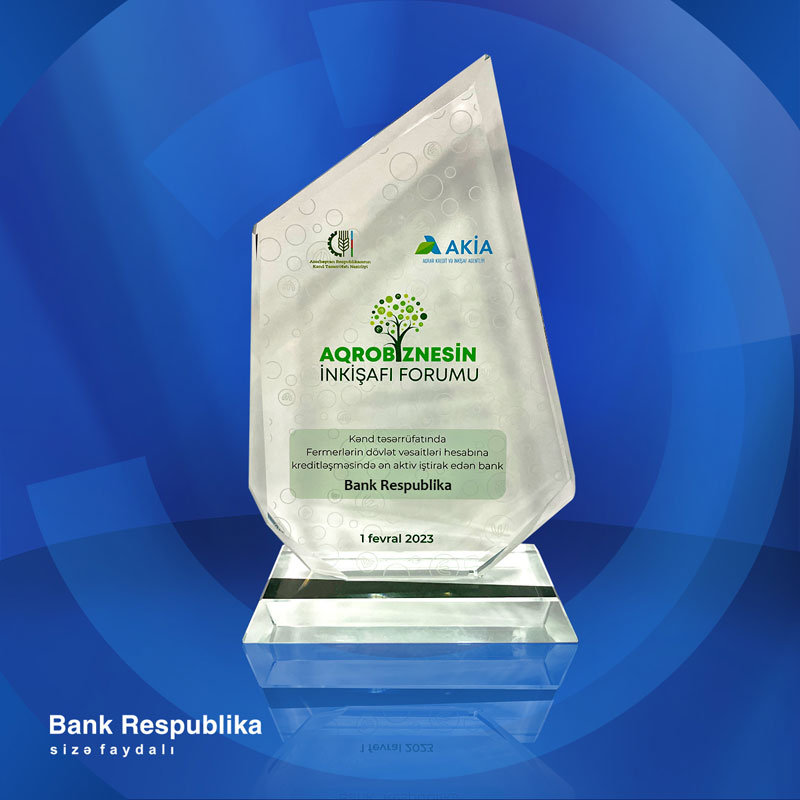 Ölkəmizdə sahibkarlığın və xüsusilə də kənd təsərrüfatının inkişafına və maliyyələşməsinə daima dəstək olan Bank Respublika “Fermerlərin dövlət vəsaitləri hesabına kreditləşməsində ən aktiv iştirak edən bank” nominasiyasında mükafat qazanıb.