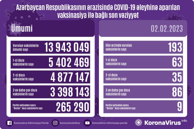 Azərbaycanda son sutkada koronavirus (COVID-19) əleyhinə 193 vaksin vurulub. Bir gündə birinci mərhələ üzrə vaksinasiya olunanların sayı 63, ikinci mərhələ üzrə vaksinasiya olunanların sayı 35, üç və daha çox doza üzrə vaksinasiya olunanların sayı 86, pozitiv nəticədən sonra buster doza üzrə vaksinasiya olunanların sayı 9 nəfərdir.