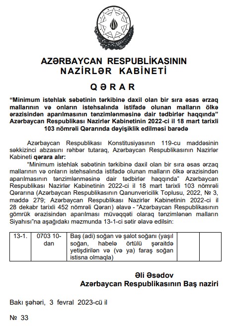 "“Minimum istehlak səbətinin tərkibinə daxil olan bir sıra əsas ərzaq mallarının və onların istehsalında istifadə olunan malların ölkə ərazisindən aparılmasının tənzimlənməsinə dair tədbirlər haqqında” Azərbaycan Respublikası Nazirlər Kabinetinin 2022-ci il 18 mart tarixli 103 nömrəli Qərarında dəyişiklik edilməsi barədə” Nazirlər Kabinetinin 03.02.2023 tarixli 33 nömrəli Qərarı baş soğan və şalot soğanının (yaşıl soğan, habelə örtülü şəraitdə yetişdirilən və faraş soğan istisna olmaqla) Azərbaycan Respublikasının gömrük ərazisindən aparılması müvəqqəti olaraq tənzimlənən malların Siyahısına daxil edilməsini nəzərdə tutur",- Nazirlər Kabinetinin şərhində deyilir.