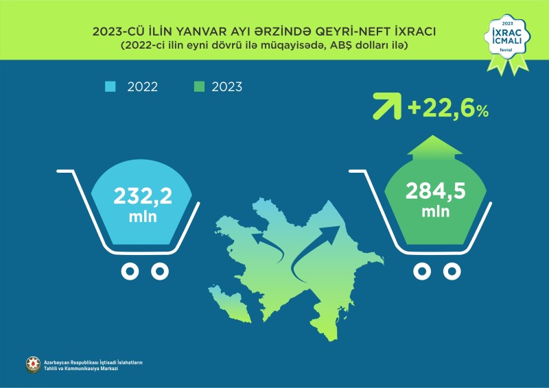 İqtisadi İslahatların Təhlili və Kommunikasiya Mərkəzinin yaydığı məlumata görə, qeyri-neft sektoru üzrə ixrac 2022-ci ilin müvafiq dövrü ilə müqayisədə 22,6% artıb. 2023-cü ilin yanvar ayı ərzində yeyinti məhsulları üzrə ixrac 64,3 milyon ABŞ dolları, qeyri-yeyinti məhsulları üzrə isə 220,2 milyon ABŞ dollarına bərabər olub.