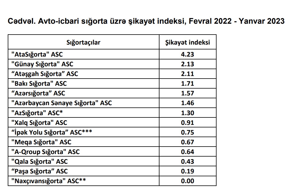 Marja xəbər verir ki, İndeksə görə, "AtaSığorta" ASC, "Günay Sığorta" ASC və “Atəşgah Sığorta” ASC ən çox şikayət edilən (xidmәt sәviyyәsinin aşağı olduğu) şirkətlərədir. "Naxçıvansığorta" ASC, “Paşa Sığorta” ASC və "Qala Sığorta" ASC xidmət səviyyəsinin yaxşı olduğu şirkətlərdir.