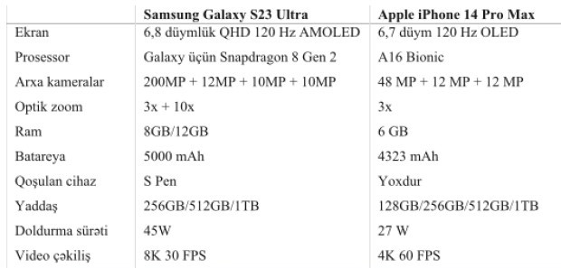 Cənubi Koreya istehsalçısının S23 Ultra modeli saatda 5 min milliamper (5000 mAh) batareya tutumuna malikdir, rəqibi iPhone 14 Pro Max isə 4323 mAh-a malikdir.
