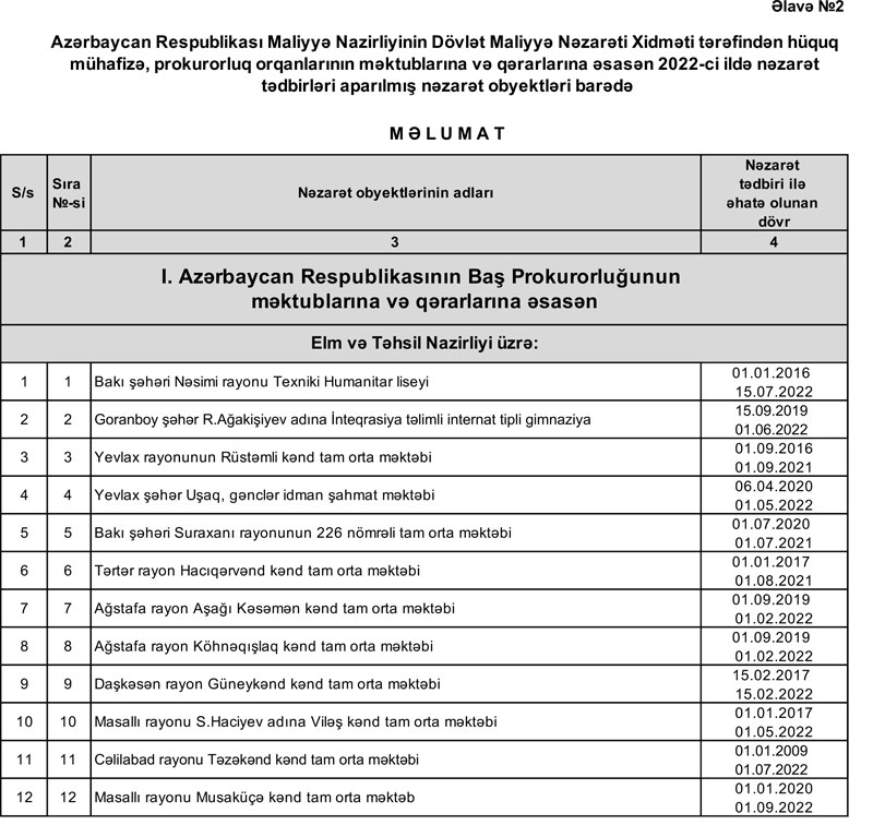 Maliyyə Nazirliyinin Dövlət Maliyyə Nəzarəti Xidməti tərəfindən 2022-ci ildə aparılmış nəzarət tədbirlərinin nəticələri haqqında məlumatlar açıqlanıb.
