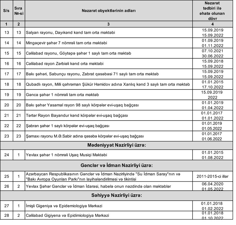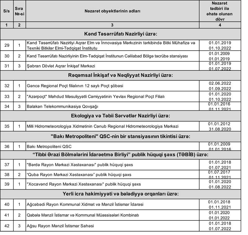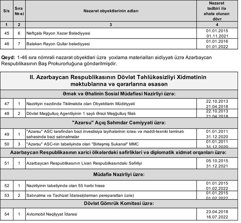 Bunlardan əlavə, Xidmət tərəfindən vətəndaş müraciətinə əsasən 4 təşkilatda müraciətdə göstərilənlər yoxlanılıb, cəmi 64,4 min manat məbləğində artıq və əsassız ödənişlərə yol verildiyi aşkar olunub və yoxlamalarla aşkar edilmiş nöqsanlara hüquqi qiymət verilməsi üçün yoxlamaların nəticələri üzrə tərtib edilmiş sənədlər Azərbaycan Respublikasının Baş Prokurorluğuna göndərilib (Əlavə №1).