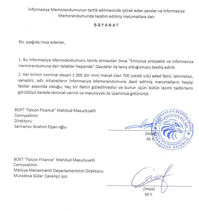 Bank Olmayan Kredit Təşkilatı "Falcon Finance" MMC istiqraz buraxılışı yolu ilə 700 min manat borc almağa hazırlaşır.
