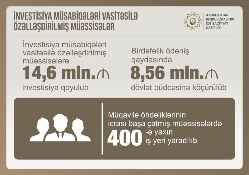 Ötən il keçirilmiş investisiya müsabiqələri vasitəsilə özəlləşdirilmiş müəssisələrə 14,6 milyon manat investisiya qoyulub və birdəfəlik ödəniş qaydasında 8,56 milyon manat dövlət büdcəsinə köçürülüb.