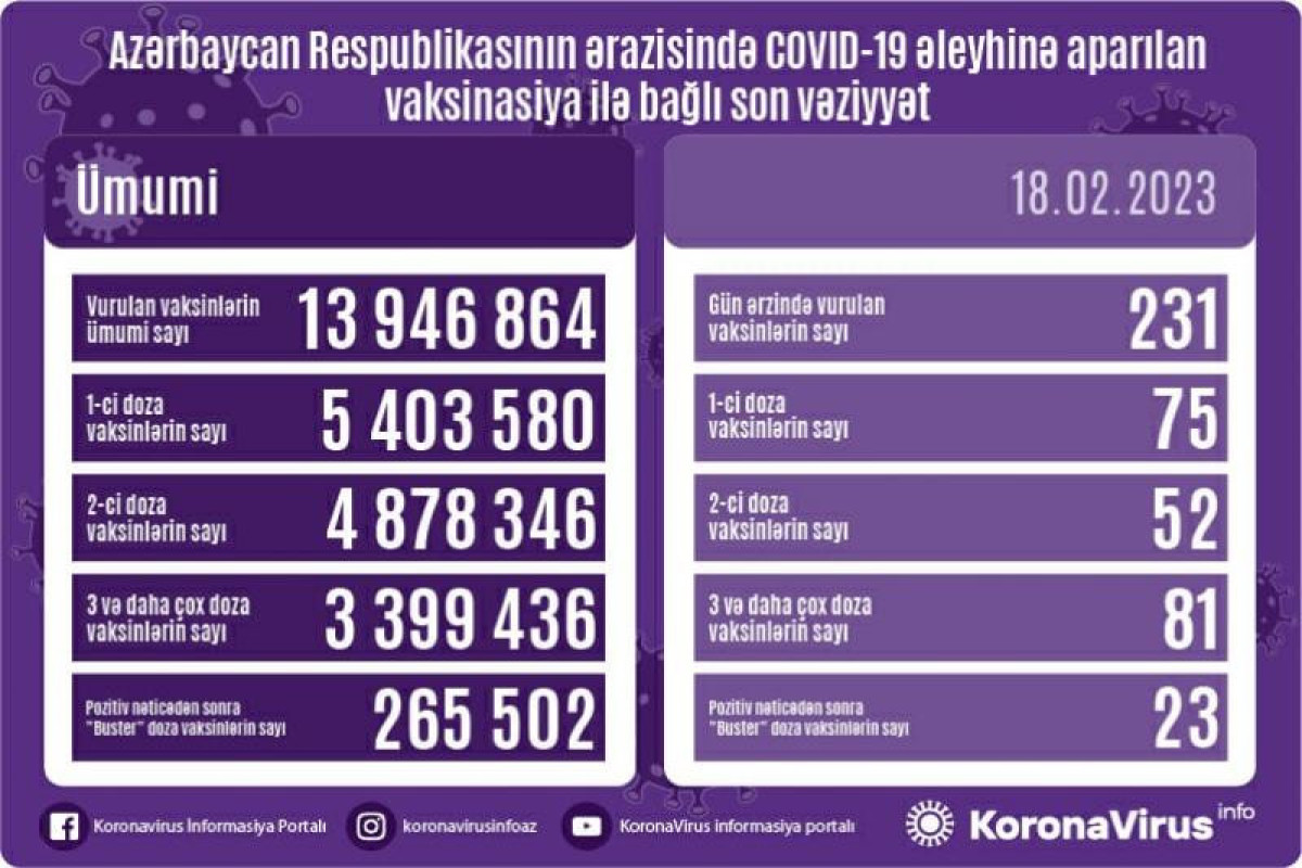 Azərbaycanda son sutkada koronavirus (COVID-19) əleyhinə 231 vaksin vurulub. Bir gündə birinci mərhələ üzrə vaksinasiya olunanların sayı 75, ikinci mərhələ üzrə vaksinasiya olunanların sayı 52, üç və daha çox doza üzrə vaksinasiya olunanların sayı 81, pozitiv nəticədən sonra buster doza üzrə vaksinasiya olunanların sayı 23 nəfərdir.