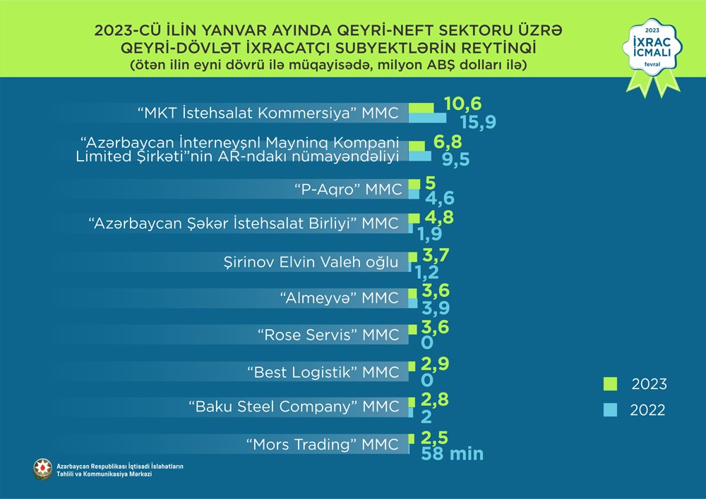 2023-cü ilin yanvar ayı üzrə hazırlanan qeyri-dövlət ixracatçı subyektlərin reytinqində ilk onluqda aşağıdakı şirkətlər təmsil olunurlar: “MKT İstehsalat Kommersiya” MMC, “Azərbaycan İnterneyşnl Mayninq Kompani Limited Şirkəti”nin Azərbaycan Respublikasındakı Nümayəndəliyi, “P-Aqro” MMC, “Azərbaycan Şəkər İstehsalat Birliyi” MMC, Şirinov Elvin Valeh oğlu, “Almeyvə” MMC, “Rose Servis” MMC, “Best Logistik” MMC, “Baku Steel Company” QSC, “Mors Trading” MMC.