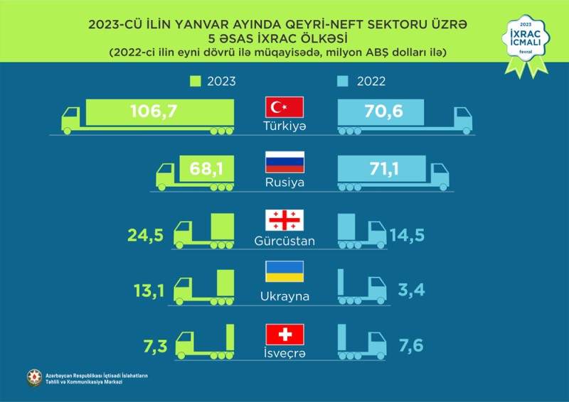 2023-cü ilin yanvar ayında qeyri-neft sektoruna aid ən çox mal ixrac edilən ölkələrin siyahısında Türkiyə (106,7 milyon ABŞ dolları) birinciliyə yüksəlib. Bu siyahıda Rusiya Federasiyası (68,1 milyon ABŞ dolları) ikinci və Gürcüstan (24,5 milyon ABŞ dolları) üçüncü olub.