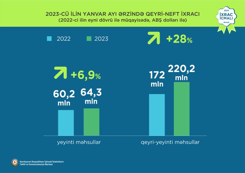 “İxrac icmalı”nın fevral sayına əsasən, 2023-cü ilin yanvar ayında Azərbaycanın ümumi ixracı 1,9 milyard ABŞ dolları, qeyri-neft sektoru üzrə ixrac 284,5 milyon ABŞ dolları təşkil edib. Qeyri-neft sektoru üzrə ixrac 2022-ci ilin müvafiq dövrü ilə müqayisədə 22,6% artıb. 2023-cü ilin yanvar ayı ərzində yeyinti məhsulları üzrə ixrac 64,3 milyon ABŞ dolları, qeyri-yeyinti məhsulları üzrə isə 220,2 milyon ABŞ dollarına bərabər olub.