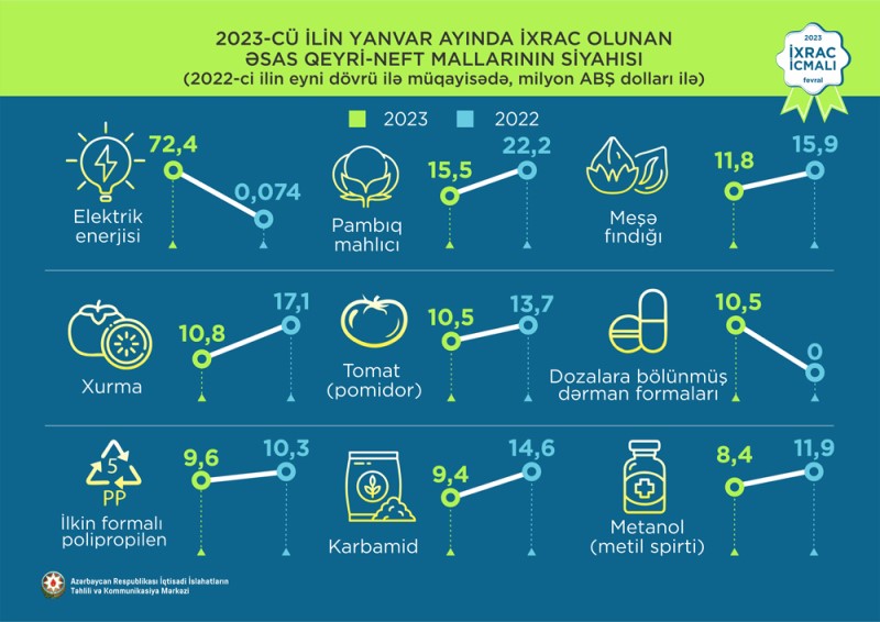 2023-cü ilin yanvar ayında ixrac edilən qeyri-neft sektoruna aid malların siyahısında elektrik enerjisi (72,4 milyon ABŞ dolları) birinci, pambıq mahlıcı (15,5 milyon ABŞ dolları) ikinci və meşə fındığı (11,8 milyon ABŞ dolları) üçüncü olub.