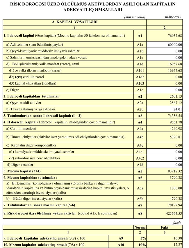 31 İyun 2017-ci il tarixində “Azərbaycan Sənaye Bankı” nın cəmi aktivləri 935 milyon 523 min manat, cəmi öhdəlikləri 846 milyon 599 min manat, cəmi kapitalı isə 88 milyon 923 min manat təşkil edib. Ötən ilin sonunda Bank 787 milyon 179 min manat cəmi aktivlərə, 702 milyon 525 min manat cəmi öhdəliklərə və 84 milyon 653 min manat cəmi kapitala malik idi.