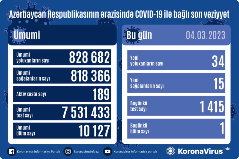 Azərbaycan Respublikasında koronavirus (COVID-19) infeksiyasına 34 yeni yoluxma faktı qeydə alınıb, 15 nəfər müalicə olunaraq sağalıb.