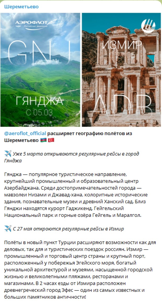 Martın 5-dən Rusiyanın ən böyük hava yolları şirkəti “Aeroflot” Şeremetyevo hava limanından Gəncəyə uçuşlara başlayacaq.