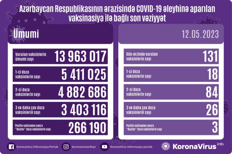 Azərbaycanda son sutkada koronavirus (COVID-19) əleyhinə 131 vaksin vurulub. Bir gündə birinci mərhələ üzrə vaksinasiya olunanların sayı 18, ikinci mərhələ üzrə vaksinasiya olunanların sayı 84, üç və daha çox doza üzrə vaksinasiya olunanların sayı 26, pozitiv nəticədən sonra buster doza üzrə vaksinasiya olunanların sayı 3 nəfərdir.