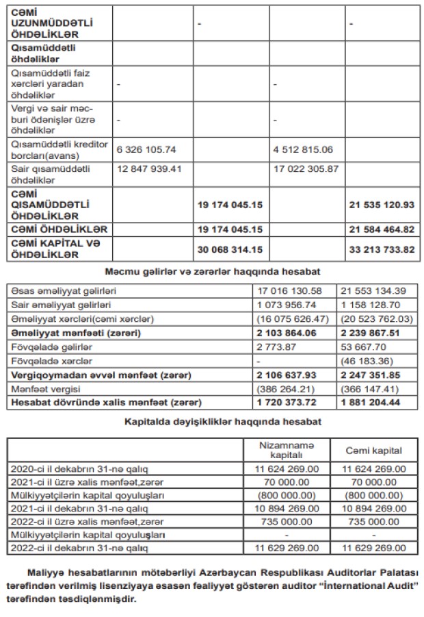 31 dekabr 2022-ci il tarixində 33 milyon 213 min manat cəmi aktivlərə malik olub. Şirkət 2021-ci ilin sonunda 30 milyon 68 min manat cəmi aktivlərə malik idi.