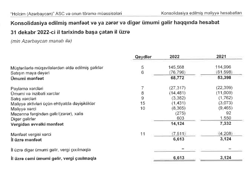 Qaradağda iri sement zavodunu işlədən "Holcim Azərbaycan" ASC 2022-ci ili 6 milyon 613 min manat xalis mənfəət ilə başa vurub. Şirkət 2021-ci ili 3 milyon 124 min manat xalis mənfəət ilə bağlamışdı. Beləliklə, ötən il "Holcim Azərbaycan"ın xalis mənfəəti 2,1 dəfə artıb. Xalis mənfəətin artması gəlirin artmasından qaynaqlanır.