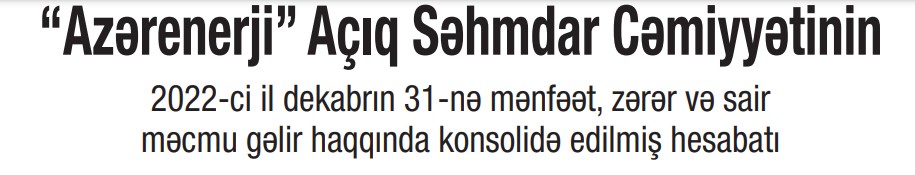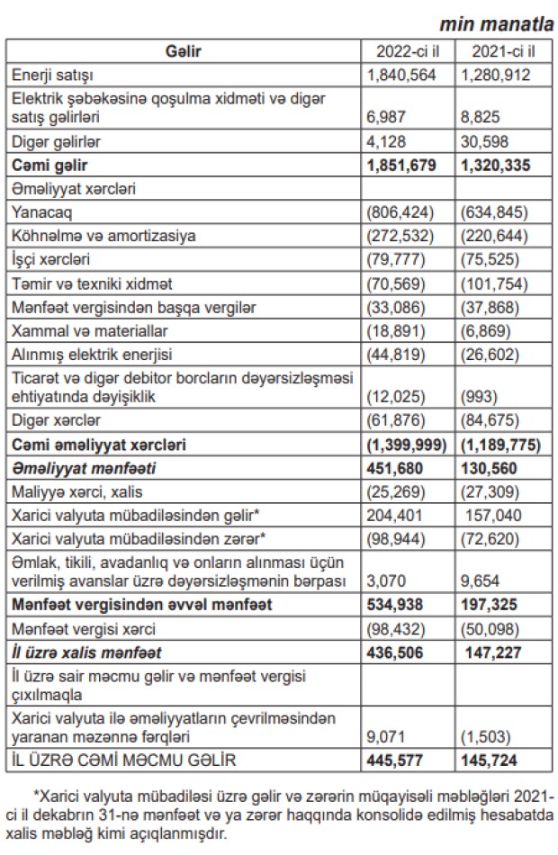 "Azərenerji" ASC 2022-ci ili 436 milyon 506 min manat xalis mənfəət ilə başa vurub. Dövlət şirkəti 2021-ci ili 147 milyon 227 min manat xalis mənfəət ilə bağlamışdı. Beləliklə, ötən il "Azərenerji"nin xalis mənfəəti təxminən 3 dəfə və ya 289 milyon 279 min manat artıb. Xalis mənfəətin artması gəlirlərin artmasından qaynaqlanır.