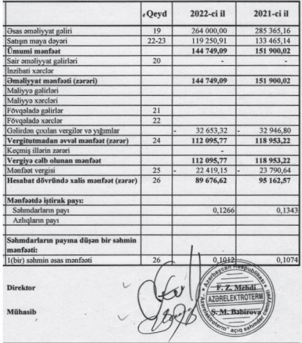 Müxtəlif metal konstruksiyaların istehsalı ilə məşğul olan "Azərelektroterm" ASC 2022-ci ili təxminən 90 min manat xalis mənfəət ilə başa vurub. Şirkət 2021-ci ili 95 min manat xalis mənfəət ilə bağlamışdı.