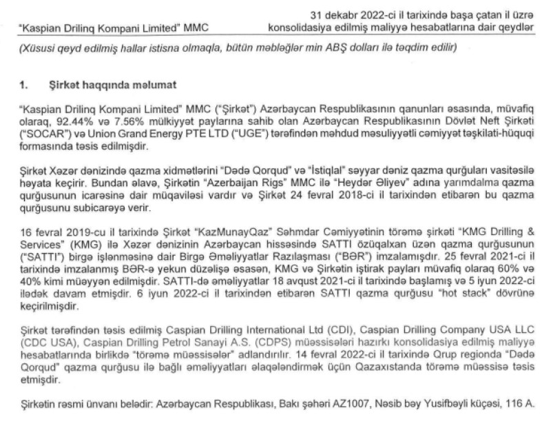 Qeyd edək ki, "Kaspian Drilinq Kompani" şirkətinin 92,44%-i SOCAR-a 7,56%-i "Union Grand Energy PTE LTD" şirkətinə məxsusdur.