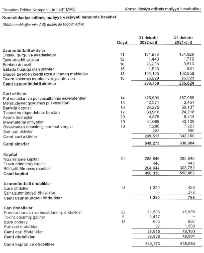 "Kaspian Drillinq Kompani"nin 2021-ci ilin sonunda 303 milyon 789 min dollar olmuş bölüşdürülməmiş mənfəəti ötənilki zərər qədər azalaraq 204 milyon 44 min dollara geriləyib.