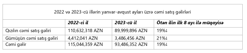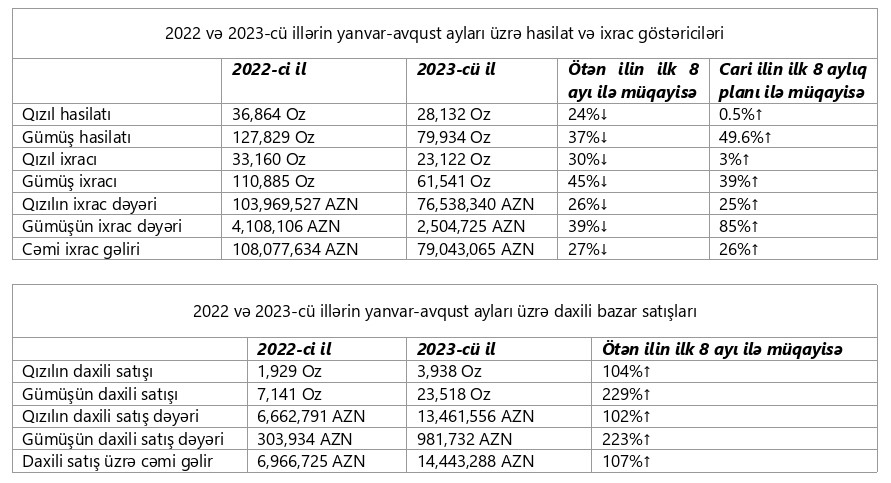 Qeyd edilib ki, 1 sentyabr 2023-cü il tarixinə QSC tərəfindən qiymətli metalların yerli və xarici bazarlarda satışı nəticəsində əldə etdiyi ümumi gəlir 1 milyard 49 milyon 202 min manata çatıb. Əldə edilən vəsaitin 1 milyard 6 milyon 40 min manatını ixrac gəlirləri, 43 milyon 162 min manatını isə daxili bazar satışlarından əldə edilən gəlirlər formalaşdırır.