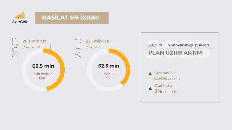 Şirkətdən Marja.az-a verilən məlumata görə, 2023-cü ilin yanvar-avqust aylarında QSC tərəfindən 28.1 min unsiya qızılın hasilatı, 23.1 min unsiya qızılın ixracı həyata keçirilib. Bununla cari ilin ilk 8 ayı üçün müəyyənləşdirilmiş qızıl hasilatı planı 0.5%, qızıl ixracı planı isə 3% artıq icra edilib. Ümumilikdə, cari il üzrə 62.5 min unsiya qızıl hasilatı və ixracı planlaşdırılıb ki, bu da ötən ilin göstəriciləri ilə müqayisədə hasilatda 1%, ixracda isə 4.4% daha artıq hədəfdir.