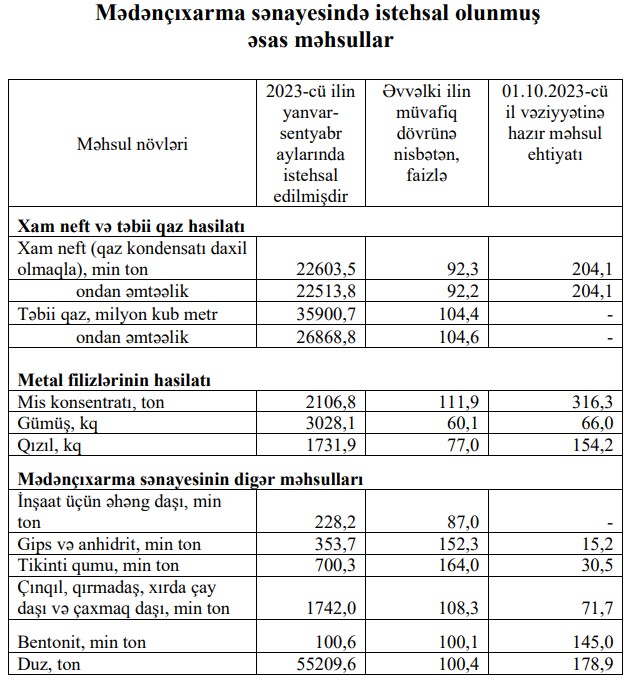 Marja.az-ın Dövlət Statistika Komitəsinin aylıq hesabatına əsasən məlumatına görə, sahənin əsas məhsulu olan əmtəəlik neft hasilatı 22,5 milyon ton, əmtəəlik təbii qaz hasilatı isə 26,9 milyard kub metr təşkil edib. Əmtəəlik neft hasilatı əvvəlki ilin müvafiq dövrü ilə müqayisədə 7,8 faiz azalmış, əmtəəlik qaz hasilatı isə 4,6 faiz artıb.