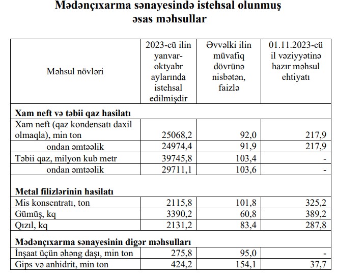 2023-cü ilin yanvar-oktyabr aylarında Azərbaycanda neft hasilatı 25 milyon ton, əmtəəlik təbii qaz hasilatı isə 29,7 milyard kub metr təşkil etmişdir.