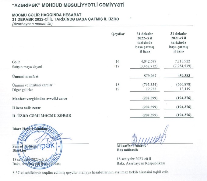 "Azəripək" MMC-nin satışın maya dəyəri və inzibati xərcləri gəlirlərini üstələdiyindən zərər ilə fəaliyyət göstərməkdədir.
