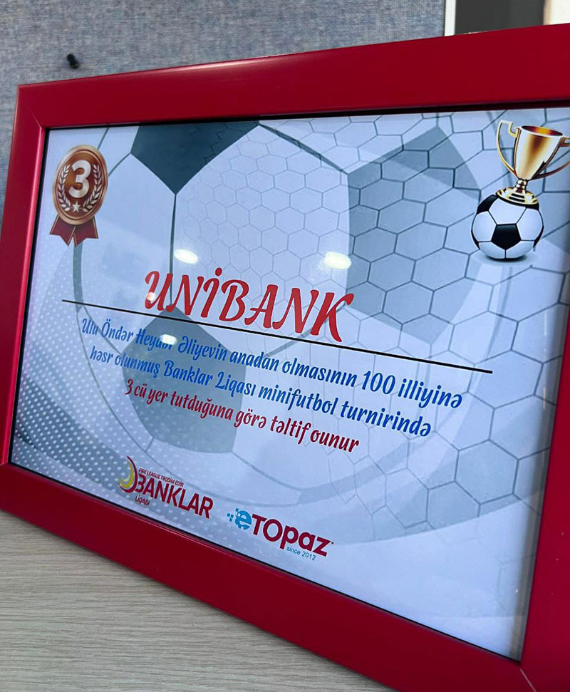 (®) Unibank komandası Ümumilli lider Heydər Əliyevin anadan olmasının 100 illiyinə həsr olunmuş Banklar liqası minifutbol turnirində 3-cü yerin qalibi olaraq, bürünc medalla mükafatlandırılıb.