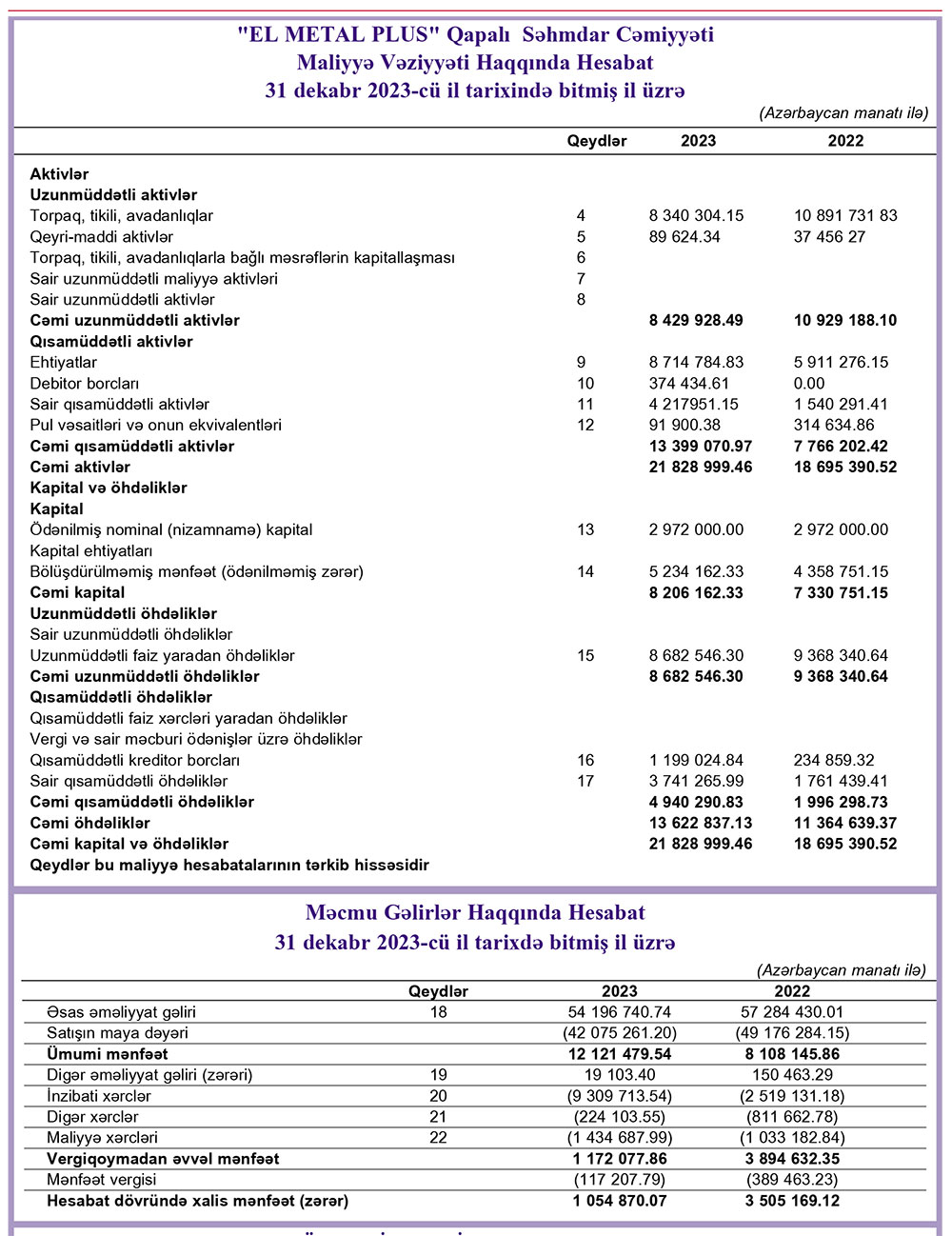 "El Metal Plus" QSC 2023-cü ili 1 milyon 55 min manat xalis mənfəət ilə başa vurub. Şirkət 2022-ci ili 3 milyon 505 min manat xalis mənfəət ilə bağlamışdı. Beləliklə, "El Metal Plus" şirkətinin 2023-cü ildə xalis mənfəəti 2022-ci illə müqayisədə 3,3 dəfə azalıb.