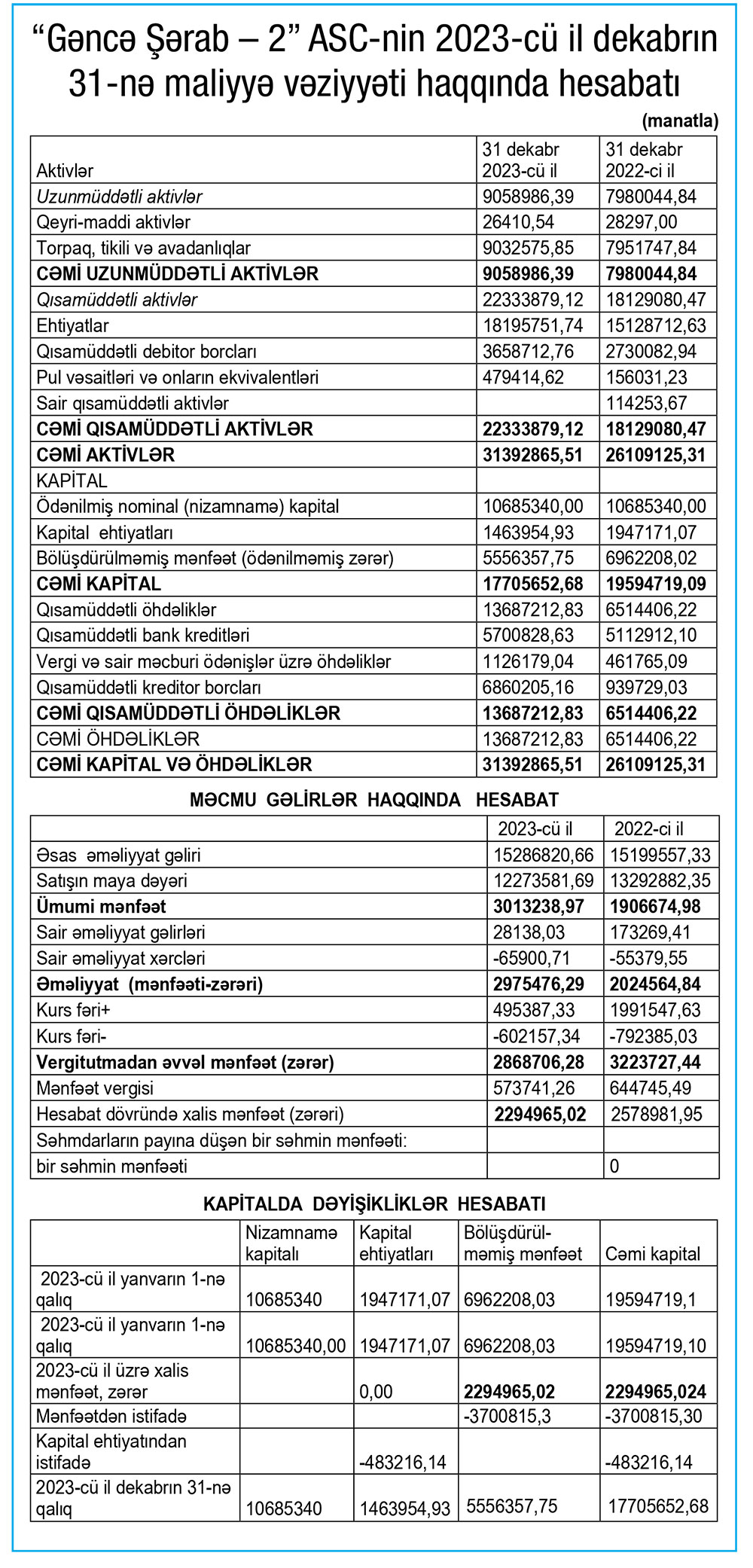 Marja.az “Gəncə Şərab – 2” ASC-nin 2023-cü il dekabrın 31-nə maliyyə vəziyyəti haqqında hesabatına istinadən xəbər verir ki, Şirkətin satışdan gəlirləri 2022-ci ildə 15 milyon 200 min manat ikən, 2023-cü ildə 15 milyon 287 min manat təşkil edib. Gəlirin artmasına baxmayaraq xalis mənfəətin azalması kurs fərqi üzrə daxilolmanın düşməsilə ilə əlaqədardır.