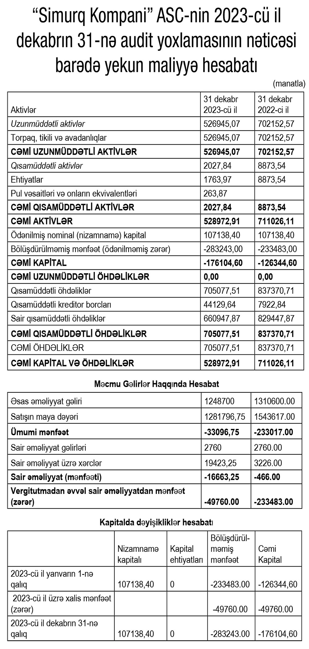 “Simurq Kompani” ASC 2023-cü ili 49 min 760 manata yaxın xalis zərər ilə bağlayıb. Şirkət 2022-ci ili 233 min 483 manat xalis zərər ilə bağlamışdı. Beləliklə, ötən il “Simurq Kompani”nin xalis zərəri 4,7 dəfə azalıb.