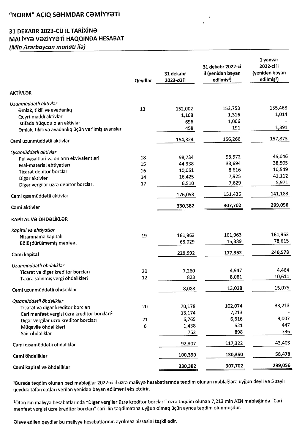 31 dekabr 2023-cü il tarixində "Norm" ASC 330 milyon 382 min manat cəmi aktivlərə malik olub. Şirkət 2022-ci ilin sonunda 307 milyon 702 min manat cəmi aktivlərə malik idi.