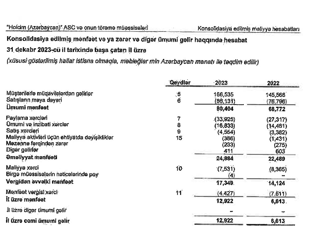 Azərbaycanda qocaman sement istehsalçısı "Holcim Azərbaycan" ASC (Qaradağda yerləşən sement zavodu) 2023-cü ili 12 milyon 922 min manat xalis mənfəət ilə başa vurub. Şirkət 2022-ci ili 6 milyon 613 min manat xalis mənfəət ilə bağlamışdı. Beləliklə, "Holcim Azərbaycan" şirkətinin xalis mənfəəti 2023-cü ildə 2022-ci illə müqayisədə 6 milyon 309 min manat və ya 95,4% (təxminən 2 dəfə) artıb.