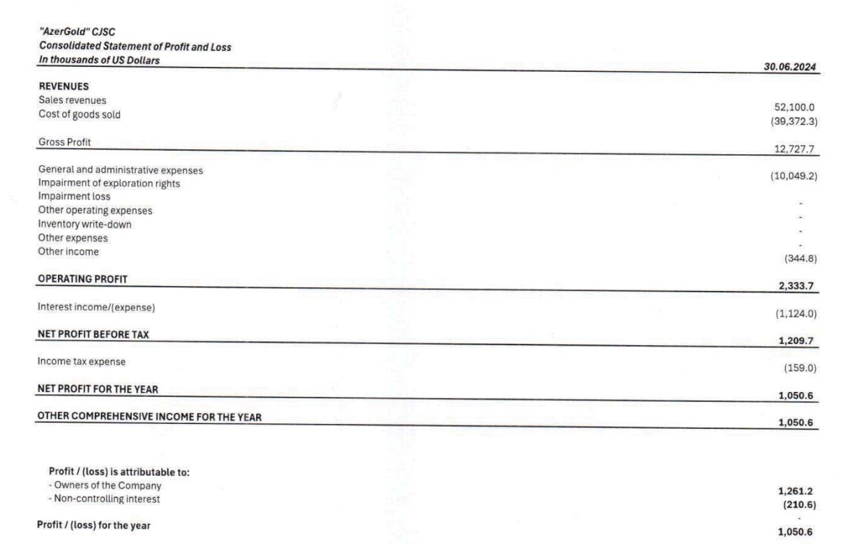 "AzerGold" QSC 2024-cü ilin 1-ci yarısını 1 milyon 51 min dollar xalis mənfəət ilə başa vurub. Şirkət 2023-cü ilin 1-ci yarısını 1 milyon 171 min dollar xalis zərər ilə bağlamışdı.